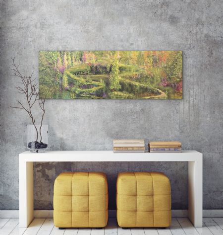 Landskab i lyse, venlige farver, med småfugle o.a..