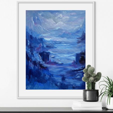 Olie på lærredsplade; kan derfor sættes i ramme med passe partout, eller hænges som det er. Ophæng medfølger.