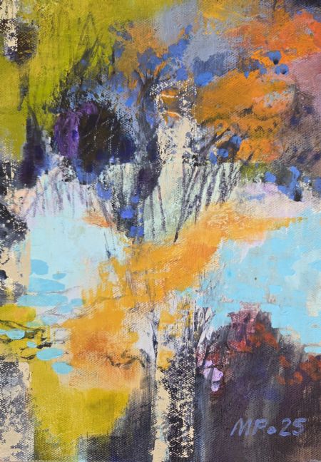 Akryl på lærred. Maleriet har malede sider, så det er derfor velegnet til at hænge uden ramme. Med ophæng. Signeret.