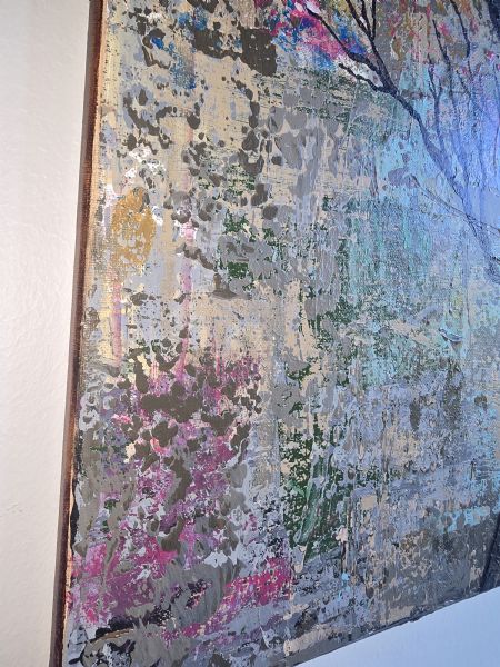 Et levende og kraftfuldt maleri, hvor et træ står i fuldt flor med lyserøde nuancer, der symboliserer håb, fornyelse og livets skønhed. Teksturerne og farvespillet giver dybde og energi, som fanger blikket og skaber varme i ethvert rum.