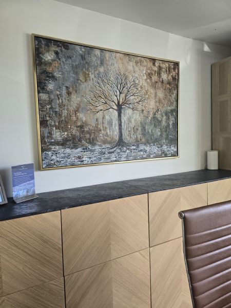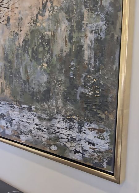 akryl på lærred, opbygget i lag, der giver dybde og stuktur. De jordnære og metalliske nuancer understreger kontrasten mellem uro og styrke, lys og skygge. Værket er indrammet i en håndlavet guld svævramme fra glarmester, som fremhæve maleriets eksklusive karakter.