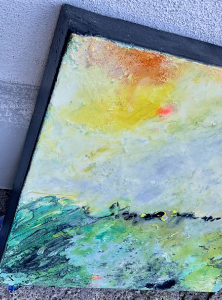 Lille lækkert akryl maleri, malet på dansk kvalitetslærred. Bemærk den 4 cm. tykke, bemalede blindramme, der nærmest gør maleriet til et lille nyt møbel, der flytter ind, og som giver lys og lethed, hvorend det placeres.