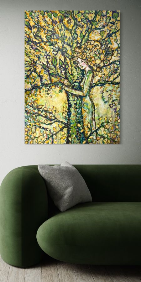 “Lyset” med pigen der krammer træer ??Dette er malet i pointilisme stil og i skønne grønlige farver.