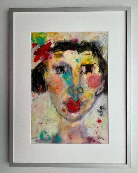 Eva er et produkt af sådan et under. Da lærredet på mit sidste maleri var rigtig godt fedtet til, og det hele sejlede, tog jeg et stykke kraftigt akvarelpapir og lod det suge al den overskydende maling. Og dette skete ikke én gang, men igen og igen. nok nærmere 10 eller 20 gange. Og pludselig fik jeg øje på Eva i skyen Jeg så hende tydeligt. Der manglede næsten kun et par øjne og en mund.