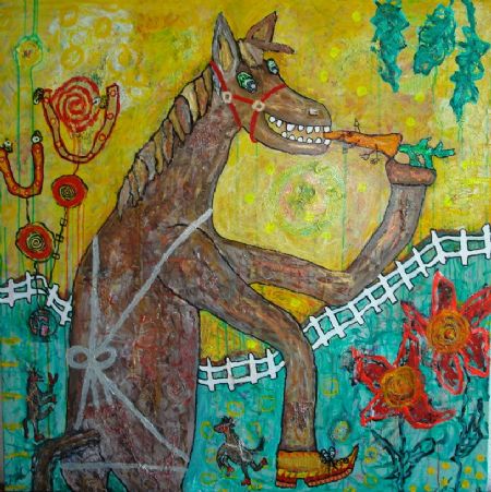 Blandede medier maleri Hestesko og hestepære af Helle Jensen malet i