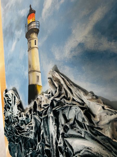 The textured fabric forms the powerful waves at the bottom, adding motion and depth to the painting — transforming simple material into the rhythm of the sea.