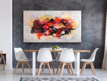 Et abstrakt maleri i skønne røde og orange nuancer. Det er energisk og kraftfuldt, og fylder godt på væggen.Som vist kan det monteres med svæveramme