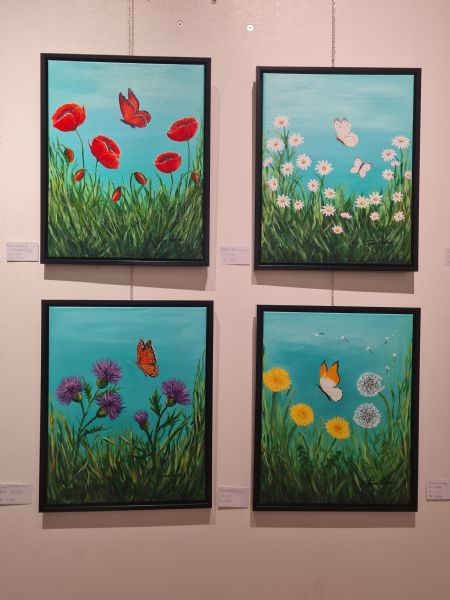 Det fjerde maleri i min serie med vilde blomster og sommerfugle. Røde valmuer og violetrandet ildfugl. Maleriet leveres i sort plastramme. Mål inklusiv ramme er 53,5 x43,5.