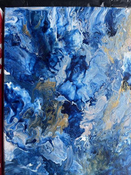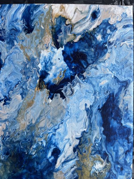 Abstrakt maleri med et flydende, marmoreret udtryk og forskellige nuancer af blå, hvid og guld.