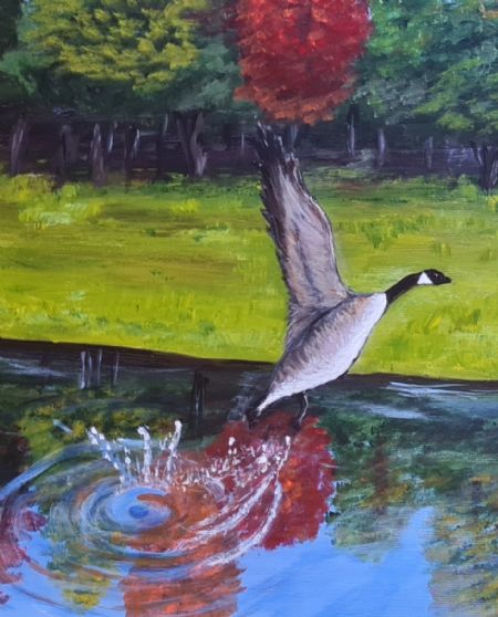 Efterår. Træernes skønne farver spejler sig i vandet. Gæssene letter og er klar til træk.