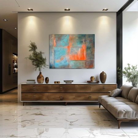 Abstrakt maleri med horisonter og farver, der måske henleder beskueren på eftertænksomhed, tænder en gnist, der flammer op til en ild … du genopdager passionen!