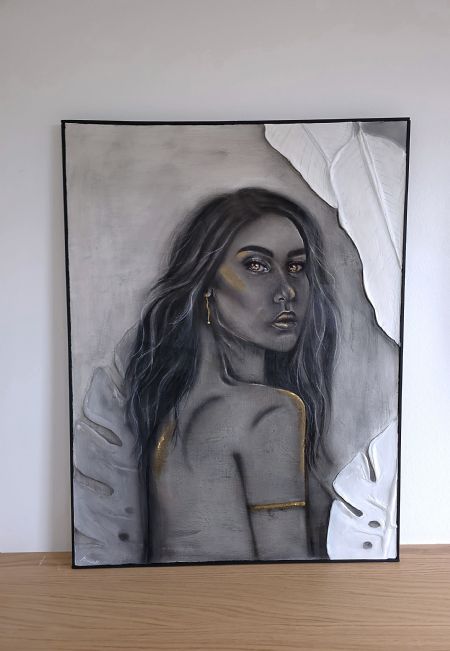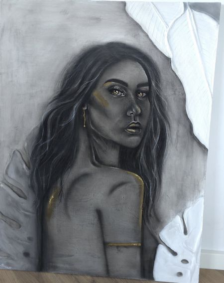 Golden Whisper er et dybt og fængslende portræt, der forener klassisk realisme med et moderne, taktilt udtryk. Udført i kul, fremstår figuren med en sjælfuld intensitet mod den monokrome baggrund.