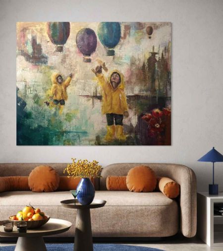 Billedet er Mixed Oil Media, teknikken giver en dybde og tekstur til scenen, hvor det bløde lys og de varme farver skaber en drømmende atmosfære.
