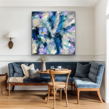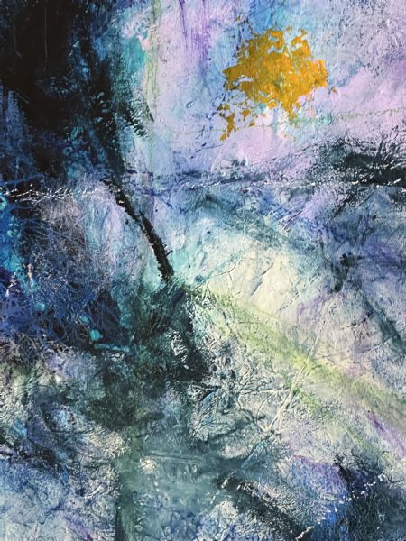 et levende abstrakt maleri i forskellige blå og lille farver med effekter og lidt struktur, Sender gerne flere detaljefotos.