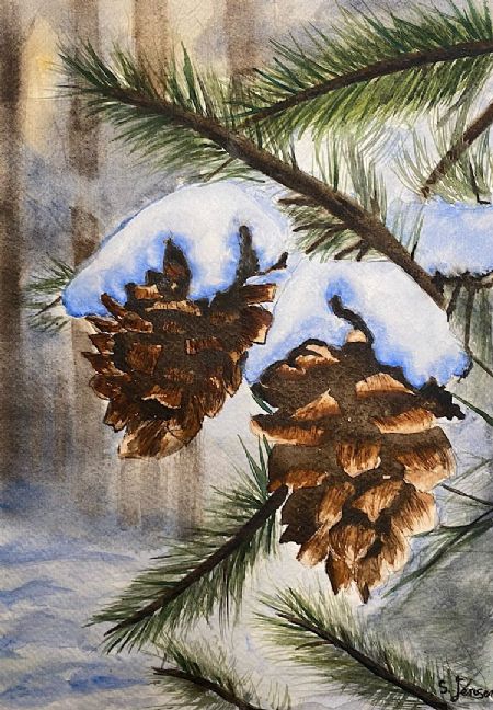 Et fredfyldt akvarelmaleri af to snedækkede fyrrekogler, der hænger fra en fyrregren, sat op mod en blød, sløret vinterskov. Dette håndmalede kunstværk indfanger naturens stille skønhed om vinteren med realistiske teksturer, sarte fyrrenåle og en fredelig snedækket atmosfære. Ideelt til sæsonbestemt indretning, naturelskere og samlere af botanisk akvarelkunst.