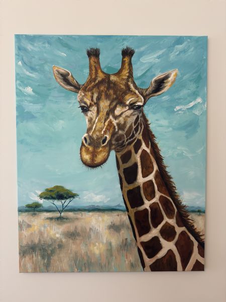 En majestætisk giraf står i et stille, kraftfuldt nærvær midt på savannen.