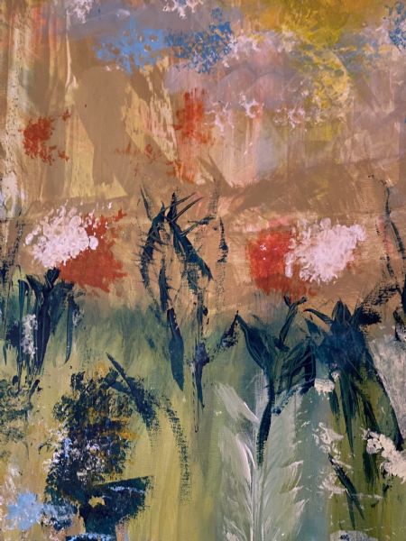 Et dejligt maleri som hedder smukke blomster i november. Blomsterne er lidt forrevne på grund af årstiden. Det har været et voldsomt regnvejr, derfor er der kommet vand i bunden af billedet, hvor folk står i vand til knæene. Jeg har brugt spartel og bobleplast, for at få noget struktur.