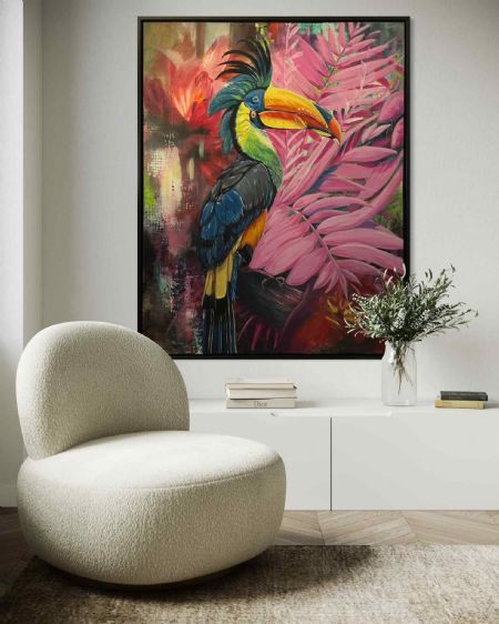 En farverig Tukan omgivet af livlige, lyserøde blade som står i skarp kontrast til den bløde baggrund der kombinerer varme og subtile teksturer.