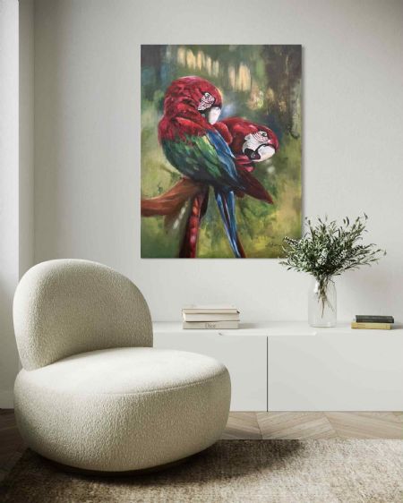 To farvestrålende araer, der sidder tæt sammen på en gren. Med deres intense røde og grønne fjerdragt udstråler de liv og skønhed. Bagrunden er difus og blød, hvilke fremhæver fuglenes detaljer og skaber en harmonisk, tropisk stemning.
