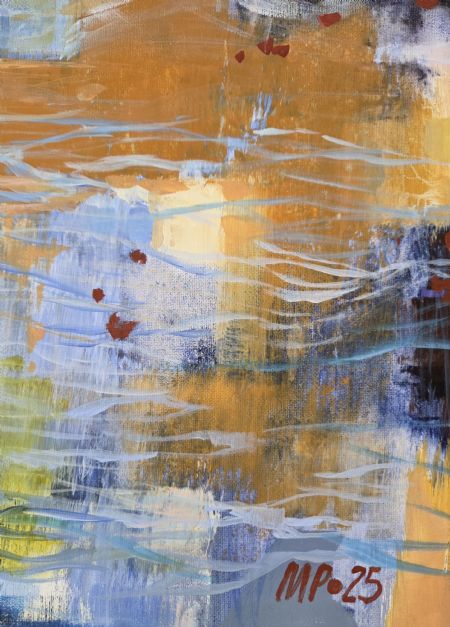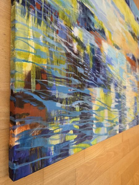 Akryl på lærred. Maleriet har malede sider, så det er derfor velegnet til at hænge uden ramme. Med ophæng. Signeret.