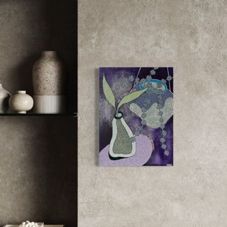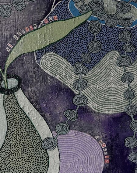 Akrylmaleri med påklistrede bogstavs udklip;
