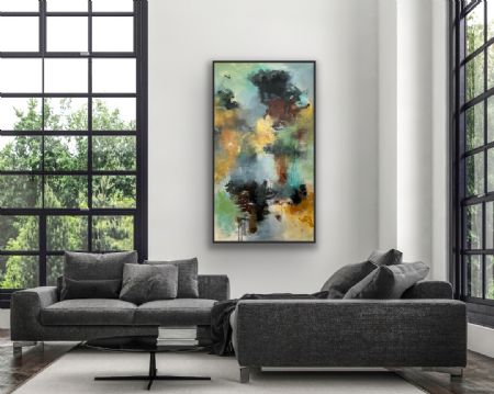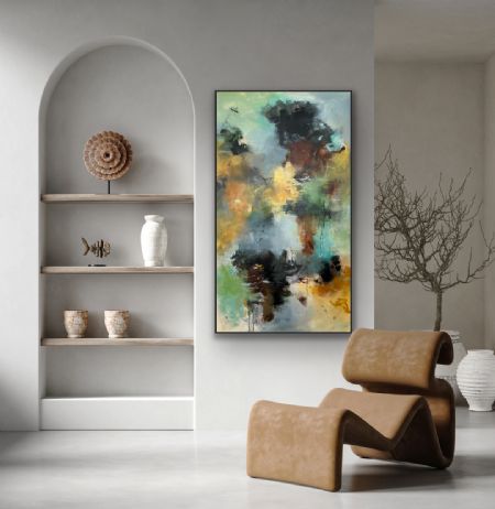 Dette abstrakte maleri er malet i de dejlige grå, grønne og gule nuancer. Det er stort, og selv om der er kontrastfyldte overgange, er det allerede beroligende at beskue. Der er harmoni og farverne klær’ hinanden.