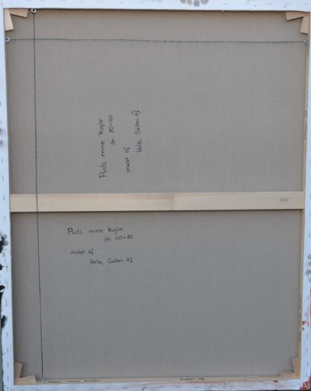 Det kan hænge på 2 måder, så enten er det 80x100 eller 100x80. Jeg har kun skrevet på bagsiden af maleriet.