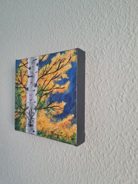Birkestamme med efterårsbaggrund.20 x 20 cm deep edge, malet sort på kanterne, så det kan hænges op uden ramme
