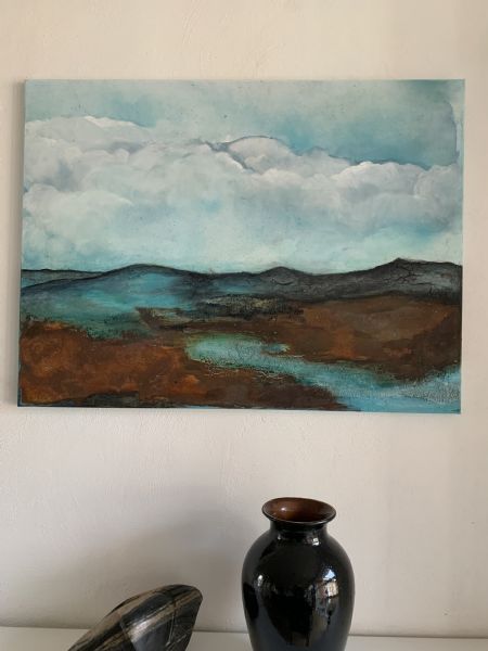 Akrylmaleri i ramme med bund af forskellige strukturmedier ( crackle, sand, lim, modelleringspasta)