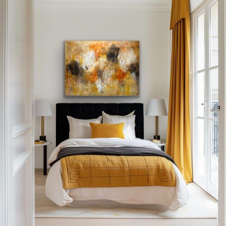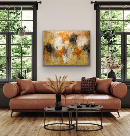 Det er et maleri, der både lyser op og inviterer til ro, og som med sin varme farvepalet giver plads til eftertanke og positivitet.