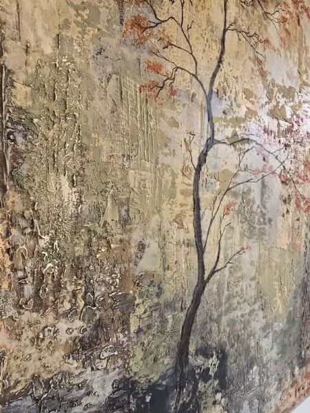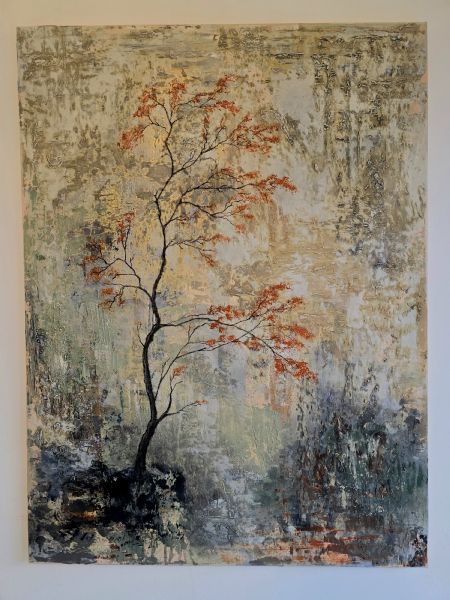Et stemningsfyldt naturmotiv, hvor et enkelt træ træder frem mod en teksturrig, abstrakt baggrund. De varme orange nuancer skaber en fin kontrast til de dæmpede jordfarver og giver værket en rolig, poetisk karakter. Maleriet forener det figurative og det abstrakte i et harmonisk og tidløst udtryk.