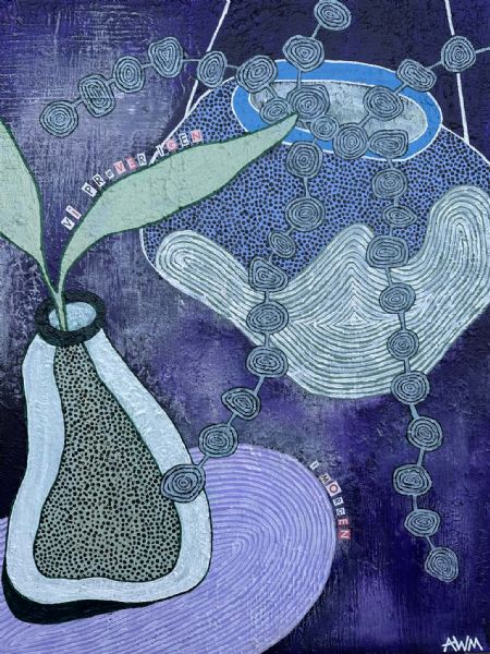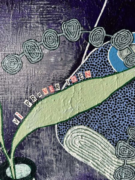 Akryl på lærred samt påklistrede udklip af bogstaver ("VI PRØVER IGEN"