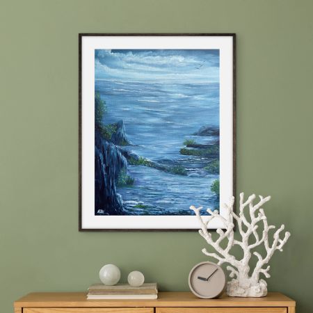 Akryl på lærredsplade; kan derfor sættes i passepartout i ramme (70x50cm), eller hænges som det er. Ophæng medfølger.