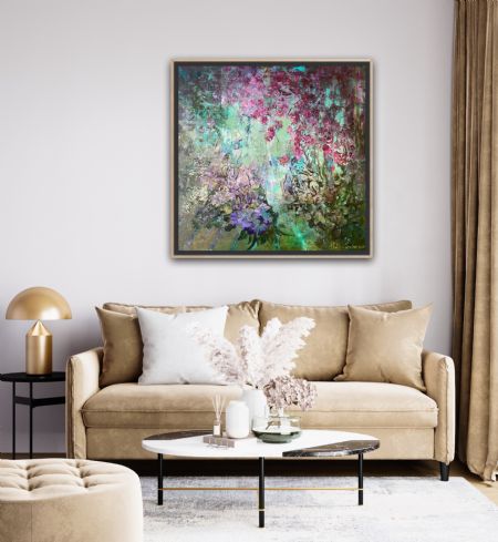 Et lagdelt maleri, hvor blomstrende former langsomt opløses i farve og bevægelse.