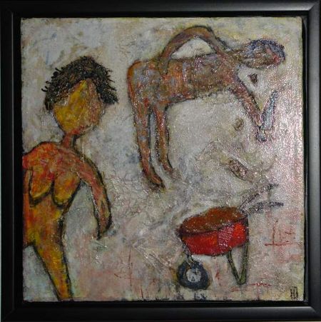 Blandede medier maleri Kan ej køre (trillebør) af Helle Jensen malet i