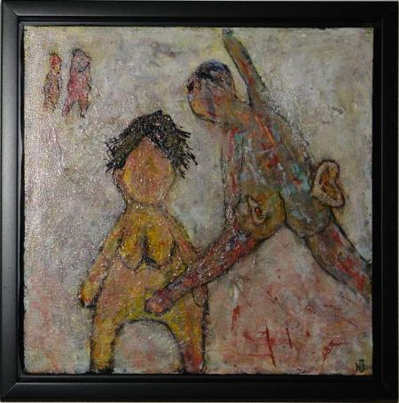 Blandede medier maleri Vi fede må svede. www.Galleri-HJ.dk af Helle Jensen malet i