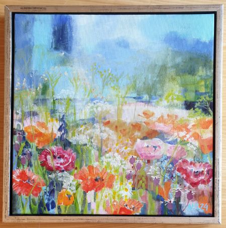 Akryl på lærred. Indrammet i en sølv svæveramme. Maleriet har malede sider - kan hænges uden ramme. Med ophæng. Signeret.