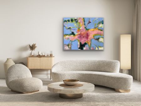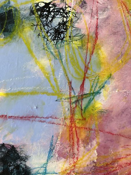 et levende maleri i primært blå og lyserød med effekter af tryk og pasteller