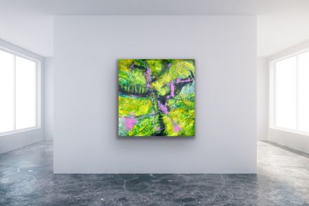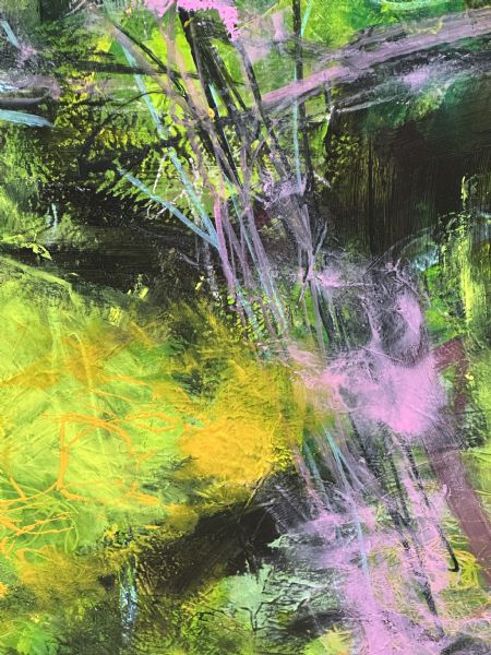 et markant maleri i primært grønne og grøngule nuancer med effekter i bl.a. pink og lille
