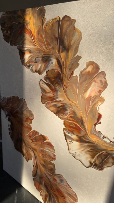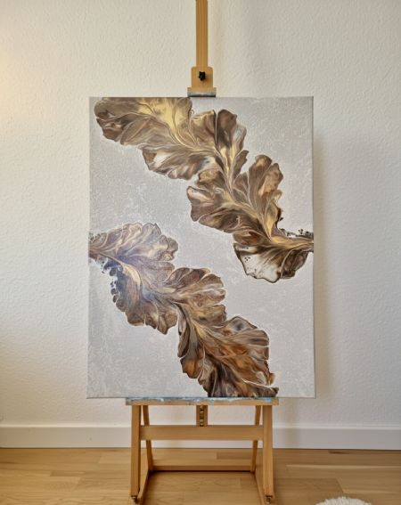 Originalt maleri malet af mig.Værket er udført i fluid art-teknikken med tilføjet struktur, som giver overfladen noget dybde. Maleriet har organiske former og minder om blade og forår