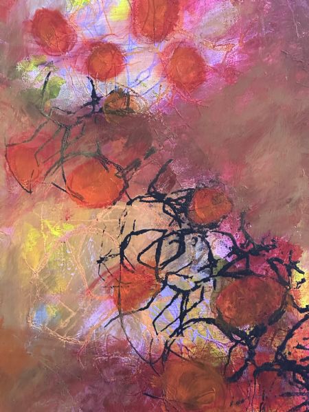 et maleri i varme gyldne, orange og lyserøde nuancer med effekter af print og lyse farver.