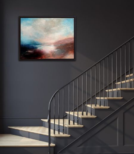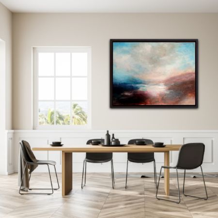Måler 120x90 inkl sort svæveramme i træ - abstrakt natur malet i skønne varme blomme brun farver med hvid blå nuancer.