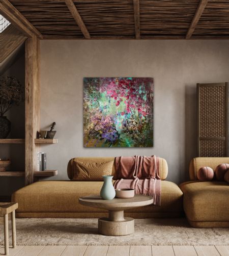 Et lagdelt maleri, hvor blomstrende former langsomt opløses i farve og bevægelse.