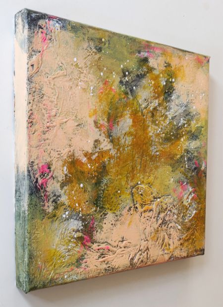 Akrylmaling, tusch og farvekridt på lærred, str 20 x 20 cm.