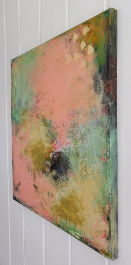Akrylmaling, tusch og farvekridt på lærred. Måler 50 x 50.