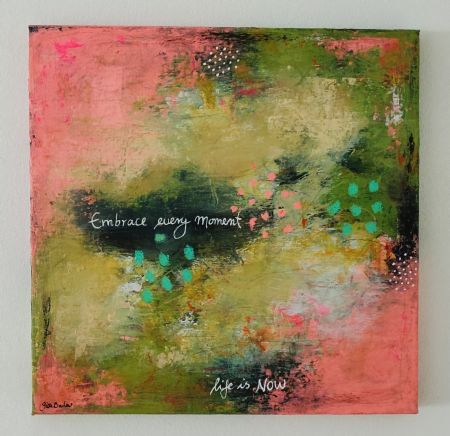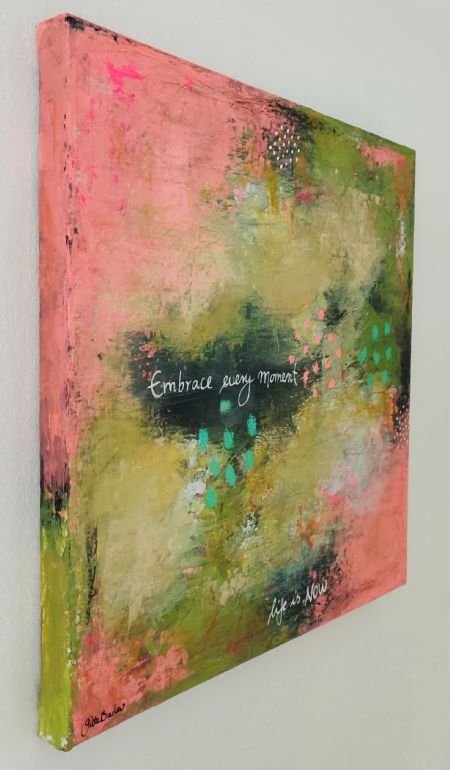 Akrylmaling, tusch og farvekridt på lærred. Måler 30 x 30 cm.