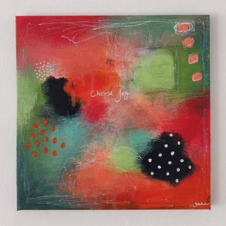 Akrylmaling, tusch og farvekridt på lærred, str 30 x 30 cm.
