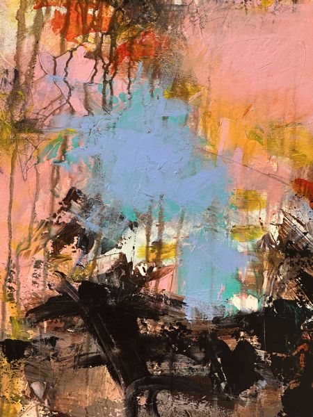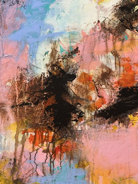 et drømmende, levende maleri primært i lyserøde og lyseblå nuancer.