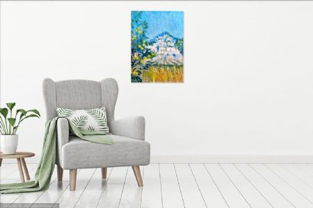 Malet med en begrænset palet og glimt af stærke kontrastfarver i naivistisk stil.