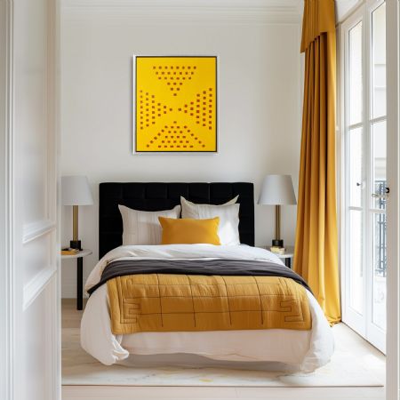 Unikt håndlavet maleri med et iøjnefaldende udtryk. De varme guldfarvede former står i flot kontrast til den klare gule baggrund.